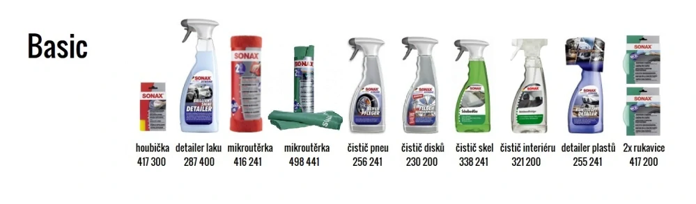 Balíček Basic obsahuje ucelenou řadu produktů pro péči o lak, skla, disky, pneumatiky a vnitřní i vnější plasty vozidel.