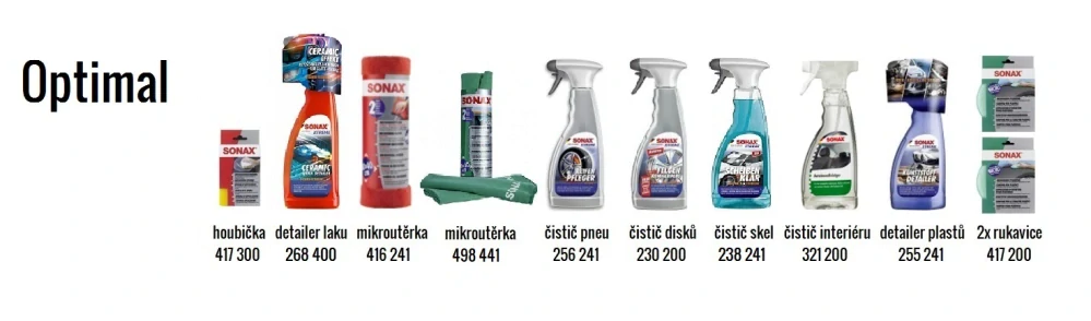 Balíček Optimal obsahuje ucelenou řadu produktů z řady Xtreme pro péči o lak, skla, disky, pneumatiky a vnitřní i vnější plasty vozidel.